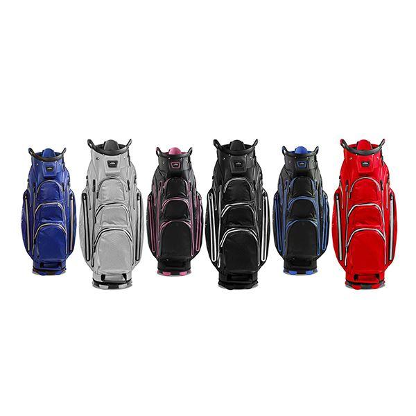 An der Seite befindet sich das gefütterte Fach für Ihre Wertsachen, ein Halter für Handtuch und Handschuh und ein Schirmhalter sowie die 14-fache durchgehende Schlägerhalterung. Hinzu kommt noch die Schlägerhaube und der gepolsterte Tragegurt. Die Bags sind ausgerüstet mit einem Gegenstück/Adapter für den magnetischen Baghalter. Die Bags passen auch auf jeden anderen Baghalter. Gewicht: 2,3 kg